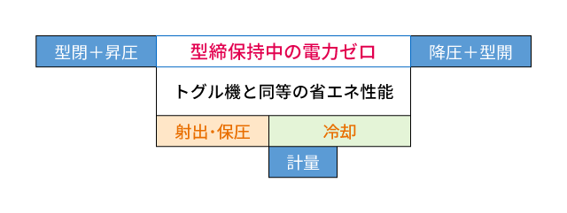 その他、作動油使用量の大幅削減による経済的及び環境的改善効果、冷却水の大幅削減などによる経済的改善効果、ハイサイクル成形による生産性向上効果、成形品質の安定化による「ムダ」ショットの削減など多くの省エネルギー効果を発揮します。